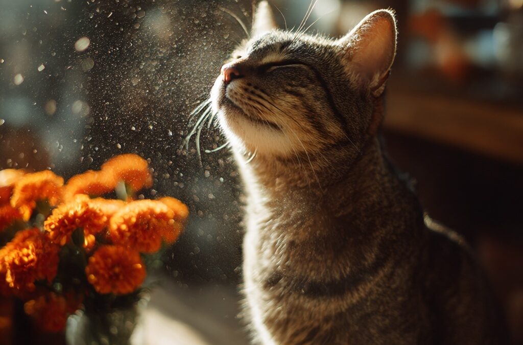 • Polen de flores de temporada (ramilletes y arreglos). Igual que el polvo, puede irritar la mucosa nasal de gatos sensibles; lo notarás por estornudos aislados y lagrimeo claro (WebMD).