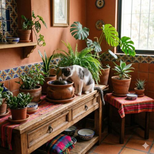 Algunas plantas de interior aportan humedad natural al ambiente al transpirar por sus hojas. Antes de incorporarlas, confirma que sean no tóxicas para gatos, ya que muchas especies decorativas sí pueden ser peligrosas si se mastican.